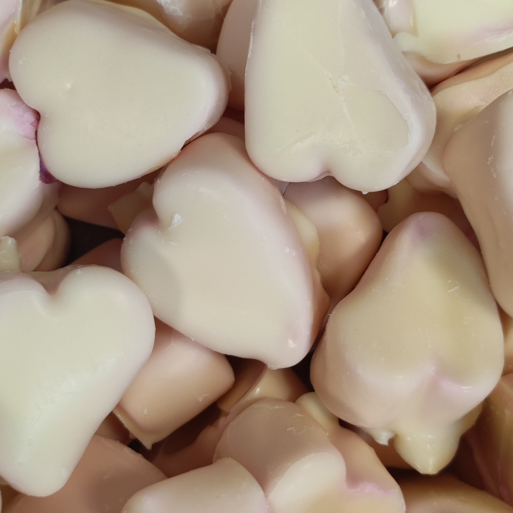 Corazones masmelo en su interior con sabor a fresa y nata y chocolate blanco crujiente en el exterior. Muy parecidos de sabor a las calaveras de chocolate y fresa. Les llamamos infieles por su dudosa forma de corazón, unidad
