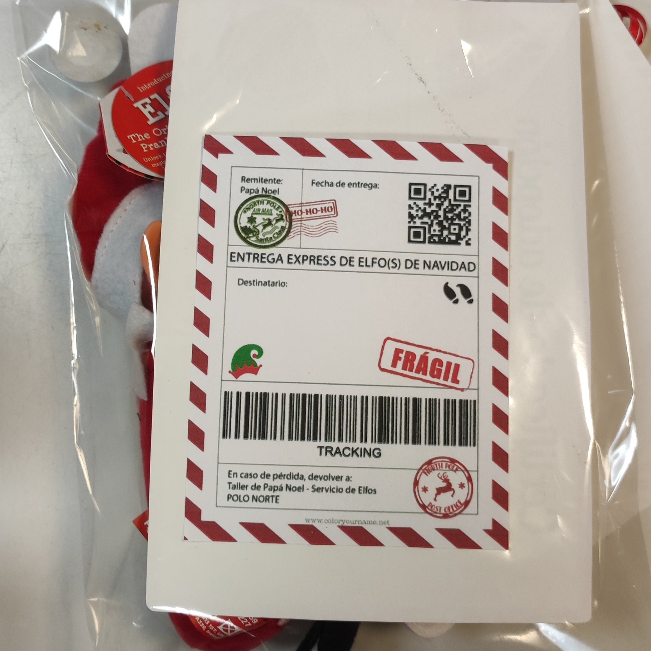 Elfo de Navidad de 30cm con carta de bienvenida, certificado de adopción y etiqueta de envío desde el polo norte.