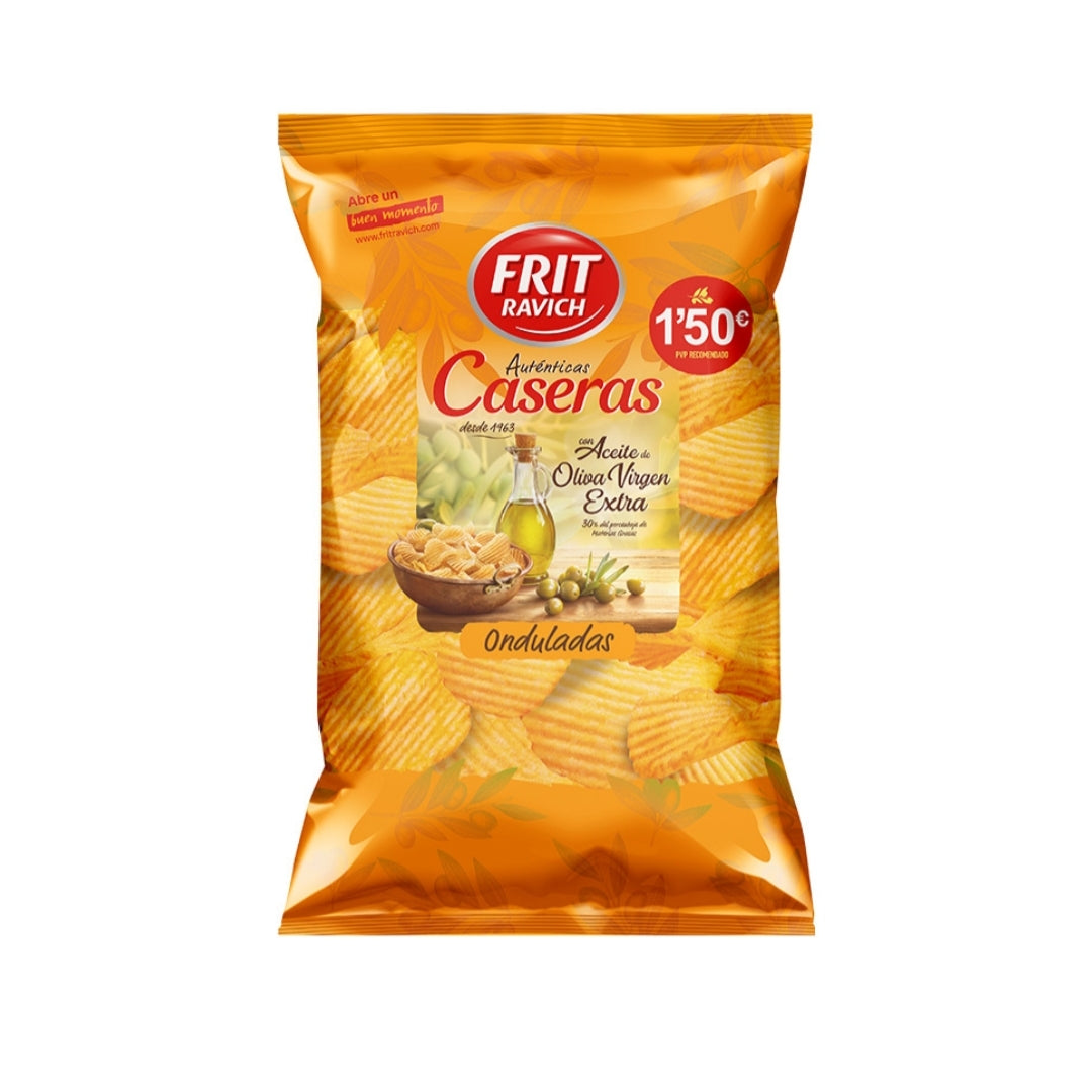 Paquete de 100gr de patatas onduladas caseras, con aceite de oliva virgen extra.